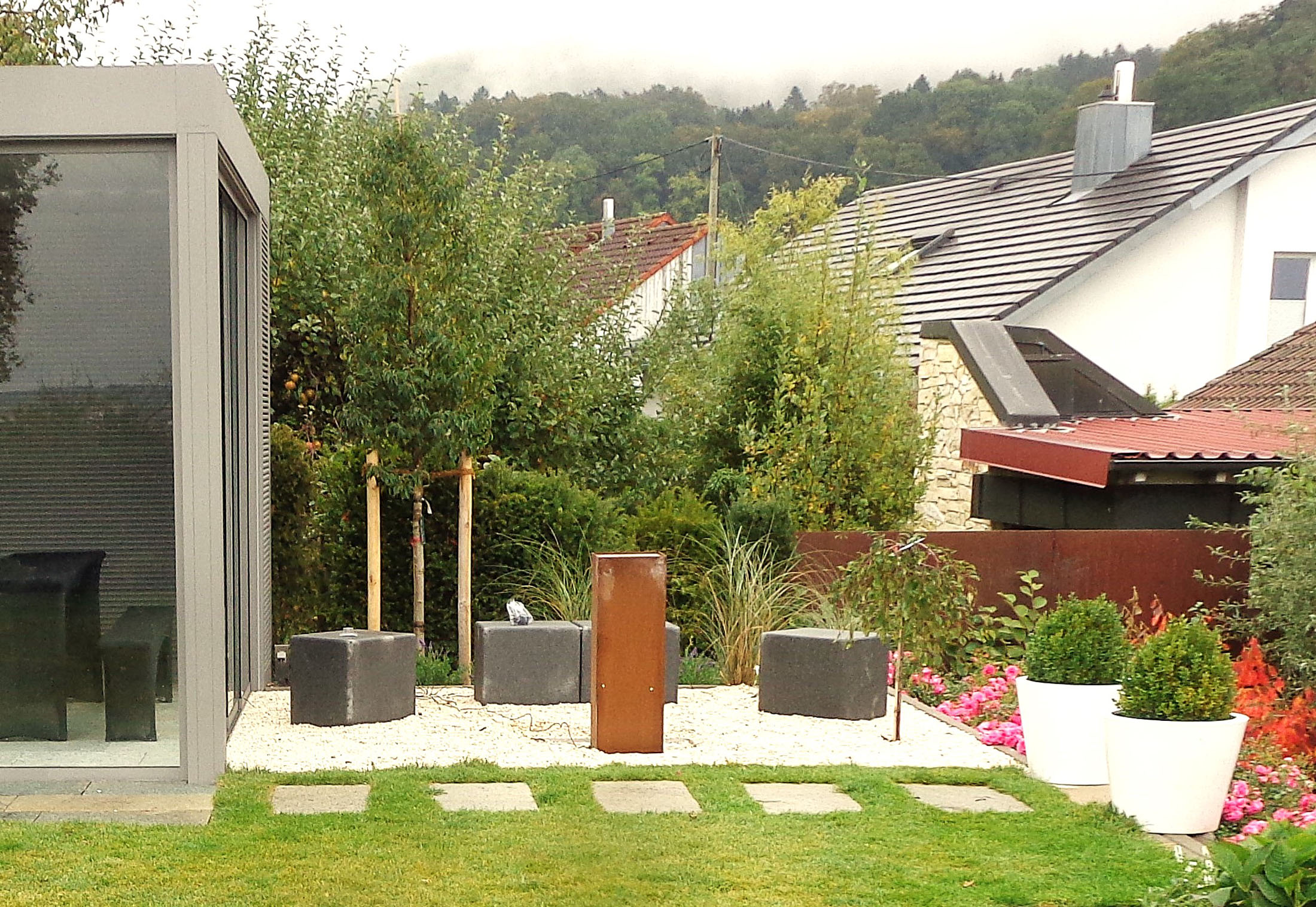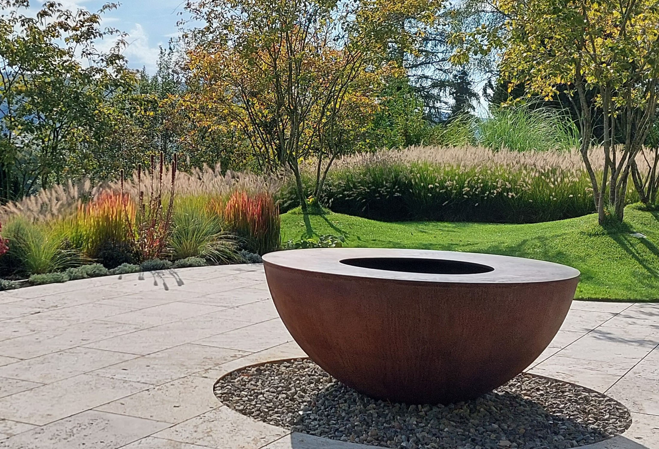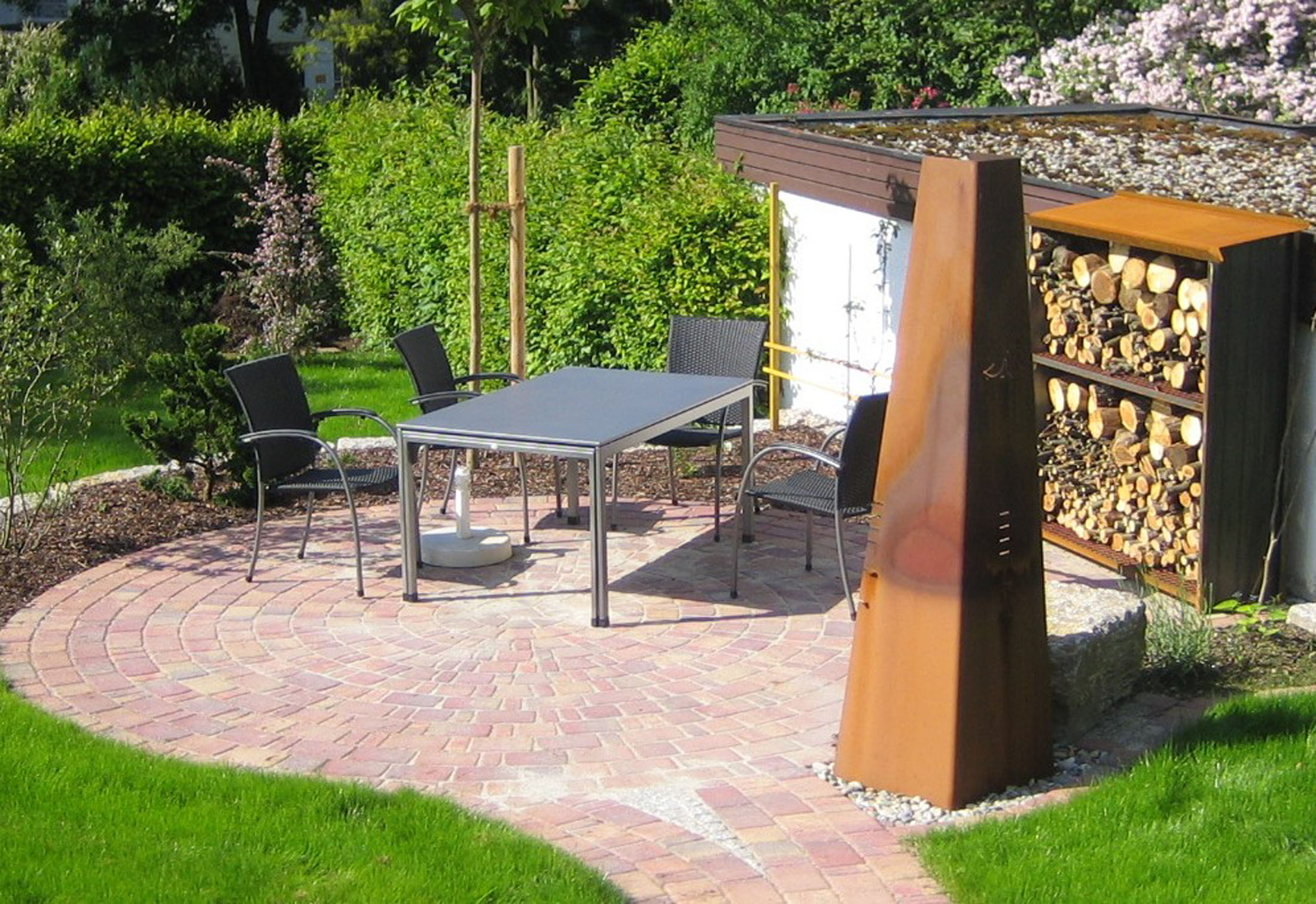 Metall setzt dagegen klare, moderne Akzente. Es steht für Präzision und eine reduzierte Formensprache und eignet sich hervorragend, um Beete, Wege oder besondere Gartenbereiche zu definieren. Pflanzgefäße, Kanten oder Feuerschalen aus Metall werden schnell zu starken Blickpunkten. Cortenstahl bringt mit seiner warmen Rostoberfläche Tiefe und Natürlichkeit, während Edelstahl oder beschichtete Metalle kühl und architektonisch wirken. So entfalten Holz und Metall jeweils für sich eine starke gestalterische Wirkung und verleihen dem Garten Charakter und Ausdruck.