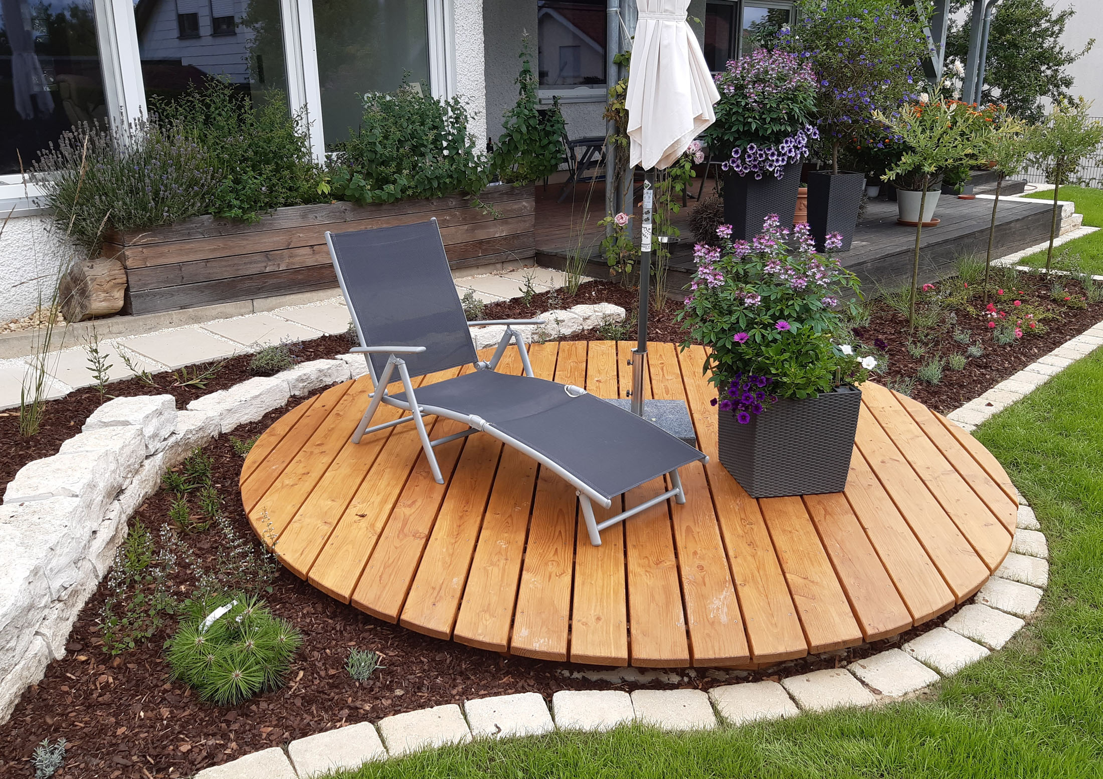 Holz bringt im Garten eine natürliche Wärme mit sich und schafft sofort eine entspannte, einladende Atmosphäre. Terrassen, Wege oder Sitzflächen aus Holz fühlen sich angenehm an und fügen sich harmonisch in die Umgebung ein. Mit der Zeit entwickelt das Material eine silbergraue Patina, die den Charakter des Gartens unterstreicht. Ob rustikal mit massiven Bänken oder modern mit klaren Linien und ruhigen Flächen – Holz wirkt lebendig und zeitlos. Pergolen, Sichtschutzelemente oder Hochbeete aus Holz geben dem Garten Struktur, ohne sich in den Vordergrund zu drängen.