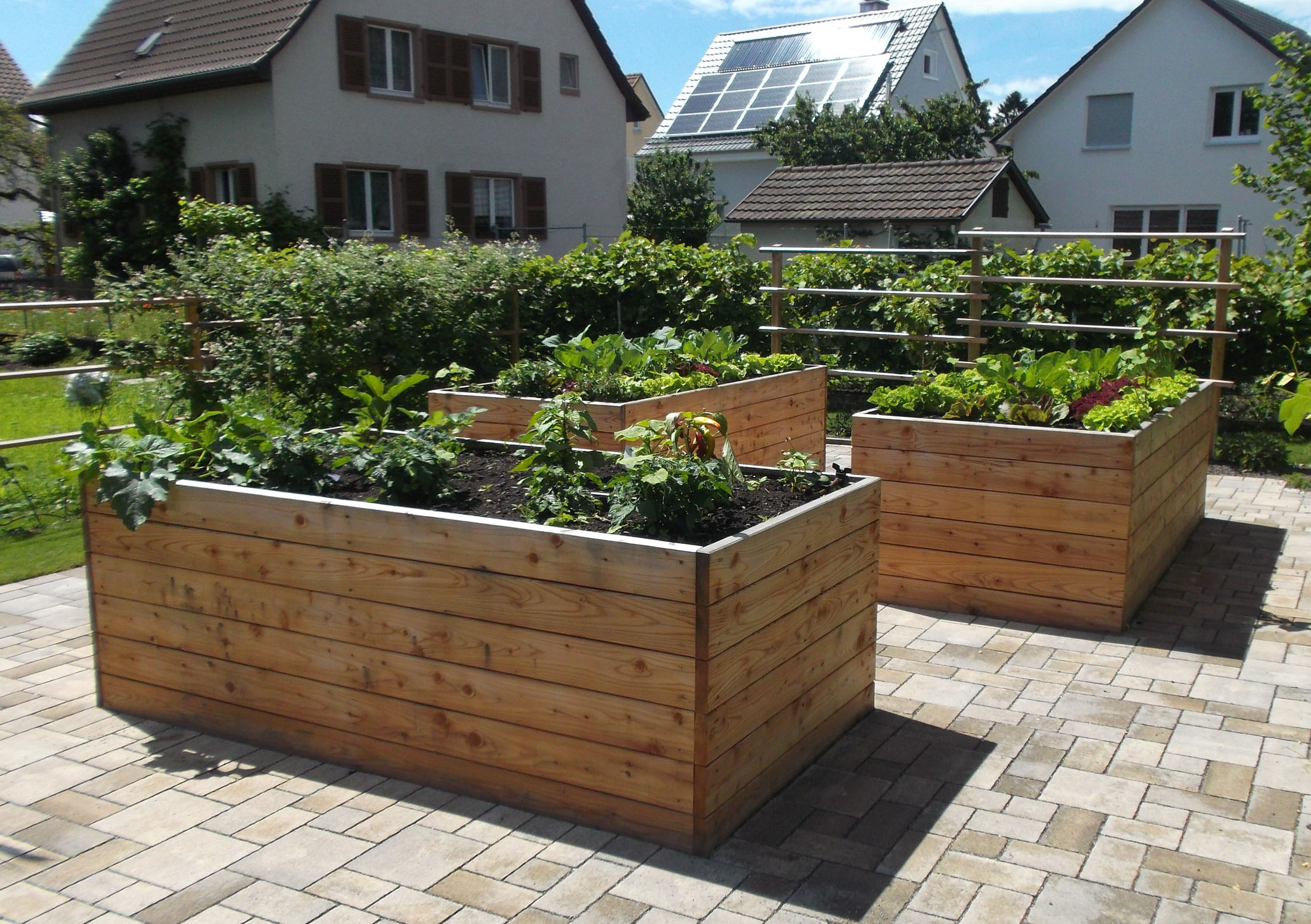 Holz bringt im Garten eine natürliche Wärme mit sich und schafft sofort eine entspannte, einladende Atmosphäre. Terrassen, Wege oder Sitzflächen aus Holz fühlen sich angenehm an und fügen sich harmonisch in die Umgebung ein. Mit der Zeit entwickelt das Material eine silbergraue Patina, die den Charakter des Gartens unterstreicht. Ob rustikal mit massiven Bänken oder modern mit klaren Linien und ruhigen Flächen – Holz wirkt lebendig und zeitlos. Pergolen, Sichtschutzelemente oder Hochbeete aus Holz geben dem Garten Struktur, ohne sich in den Vordergrund zu drängen.